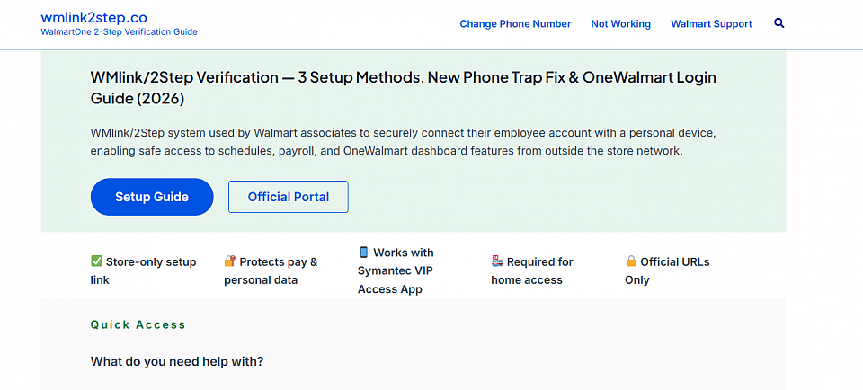 wmlink2step.co is an independent guide website that helps Walmart associates understand how to access and use the WMlink/2-Step Verification (2SV) system. It provides simple instructions for setting up authentication, downloading the Symantec VIP Access app, logging in securely, fixing verification issues, updating phone numbers, and managing secure access to employee tools like schedules, payroll, and account settings.