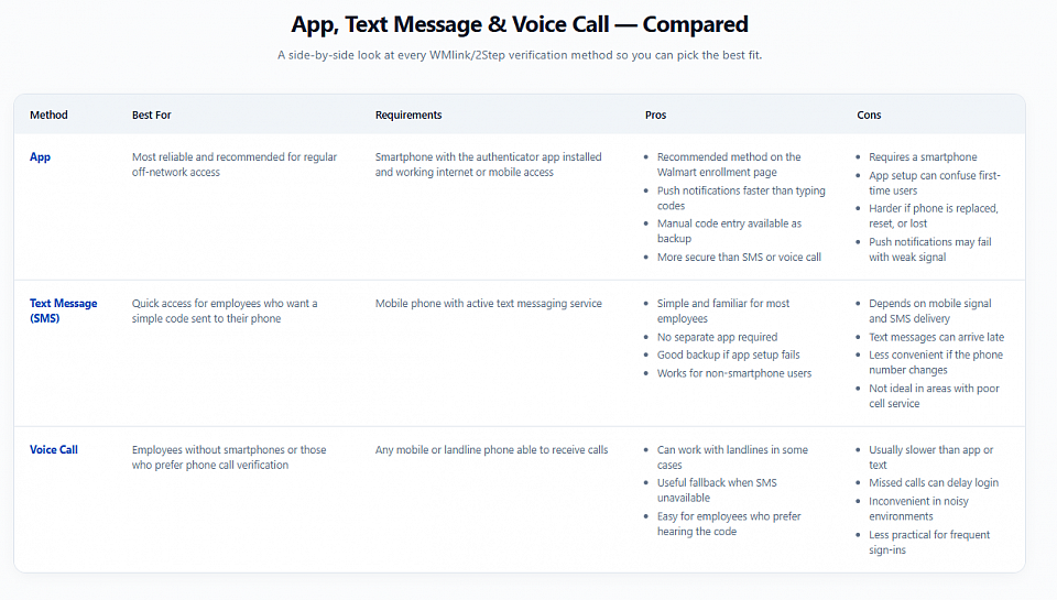 Employees often search for a “Walmart 2-step verification app” when logging in from home, but there is no official app. The system works through WMlink 2-Step Verification (2SV) by Walmart, ensuring secure access to employee accounts and data.